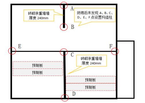 2025年8月14日早上7时许,前期施工的童某民等三人又相邀另外三人(零散务工人员大多是人拉人的方式)来到房屋装修现场,曾某元到现场交代任务后离开。六人先对二楼做标记的墙体破拆,流程是:拆墙→用编织袋转运建筑垃圾至楼下→再拆墙,如此反复。8月14日上午,二楼室内除卫生间隔墙未拆,大部分墙体已拆除。在拆除A点—C点墙体时(图五),发现该墙体是承重墙(拆墙人员凭经验判断),如果拆除了墙体,上面预制板无支撑垮掉会发生事故,于是童某民打电话给曾某元请其过来看看。曾某元来到现场后,告诉童某民等人图纸是这样标记的,按照图纸来,未向金某报告现场情况。曾某元走后,拆墙人员在拆除A点—C点墙体并没有按照他的要求拆,自行保留了A点、B点、C点各500mm左右的砖柱。