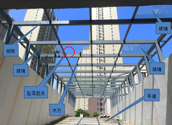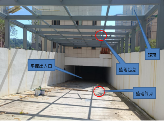 事故发生在某生活小区1#地下停车场出入口处,此处设计建造一个方条形雨棚,其地面为混凝土浇筑的两车道坡路,顶部为钢结构框架上铺设玻璃,两侧下部为砖墙、上部为钢结构支撑。车道总宽6.6m,坡道总长15.6m,坡度5%,坡段上部玻璃屋顶总长25m、宽7.6m。事故地点位于地下停车场出入口水平距离5.5m的雨棚顶部(坠落起点)正下方,坠落高度4.6m(见图一、二)。
