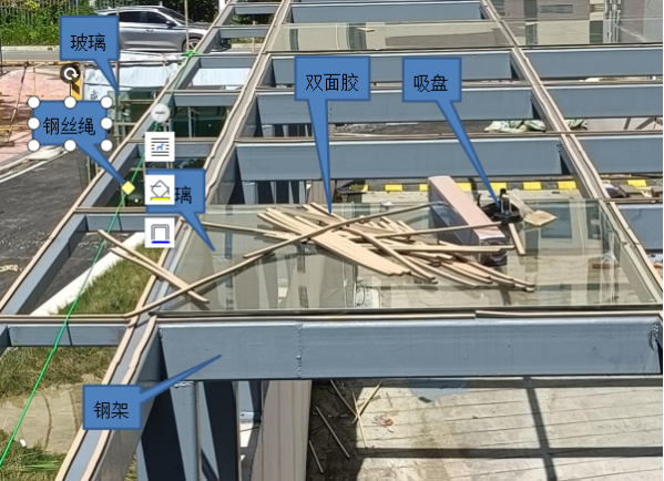 勘查时,雨棚已铺设26块玻璃,位于雨棚顶部南侧钢架上预设了一根安全绳,位于雨棚顶部东端南侧的钢架梁中已铺设一块玻璃,该玻璃上放置一个吸盘和一些双面胶,一旁的钢架梁上搁置一根方木,其下方坡道地面有一副竹跳板、几个油漆桶和被擦拭与踩踏过的血迹,雨棚南侧草坪上放置一块吊运中途暂放于此的玻璃,雨棚玻璃铺设作业面下方未设置安全网(见图四)。