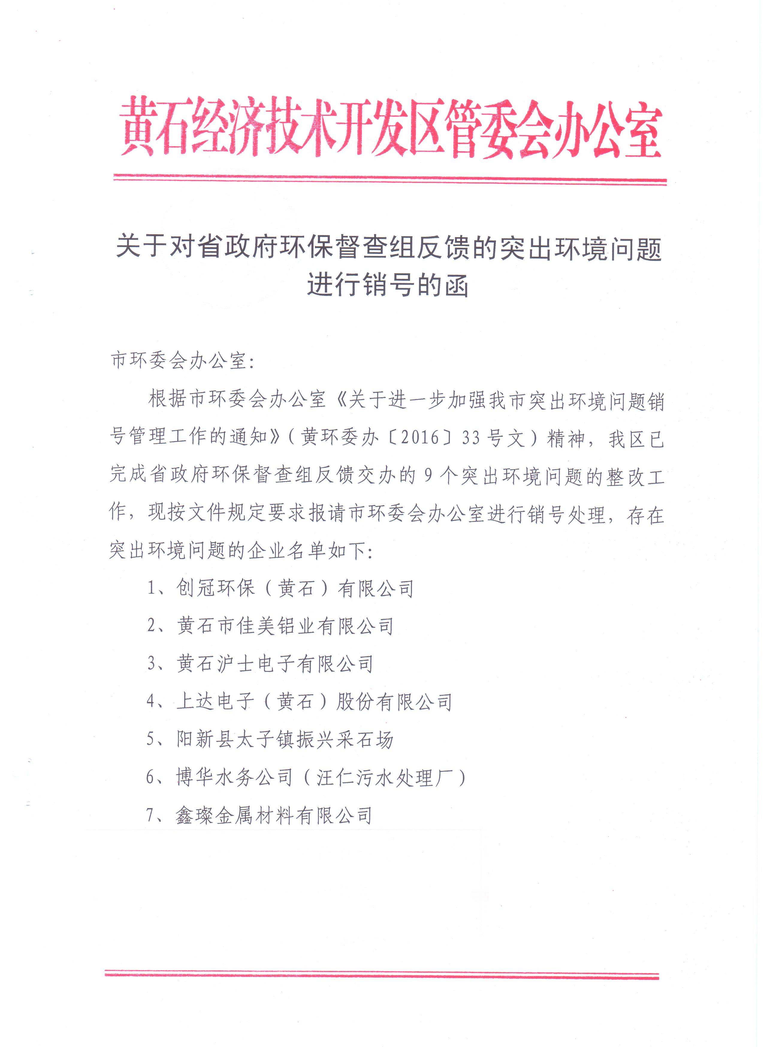 根据《省环委会关于加强全省突出问题销号管理工作的紧急通知》(鄂环委[2016]8号)文要求,为进一步提高整改效果,有力推进整改工作,现将省政府环保督查组反馈的我区突出环境问题进行销号公示。